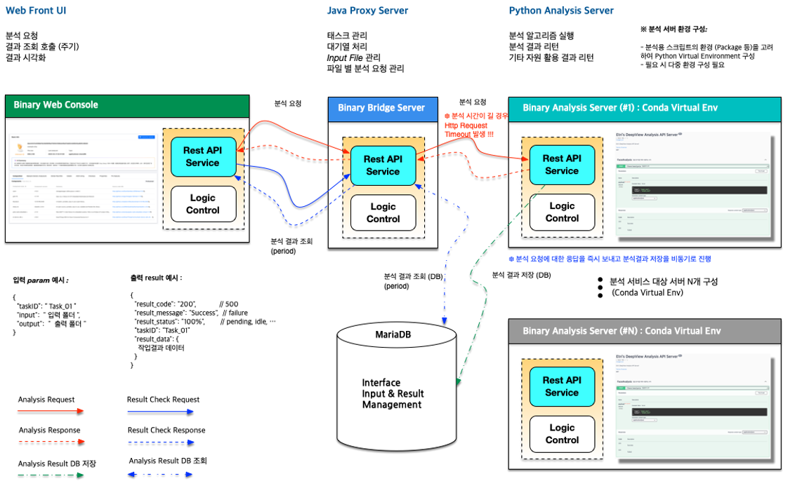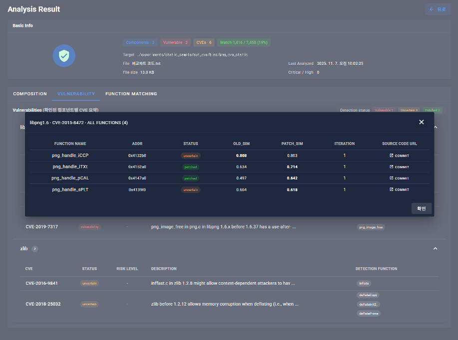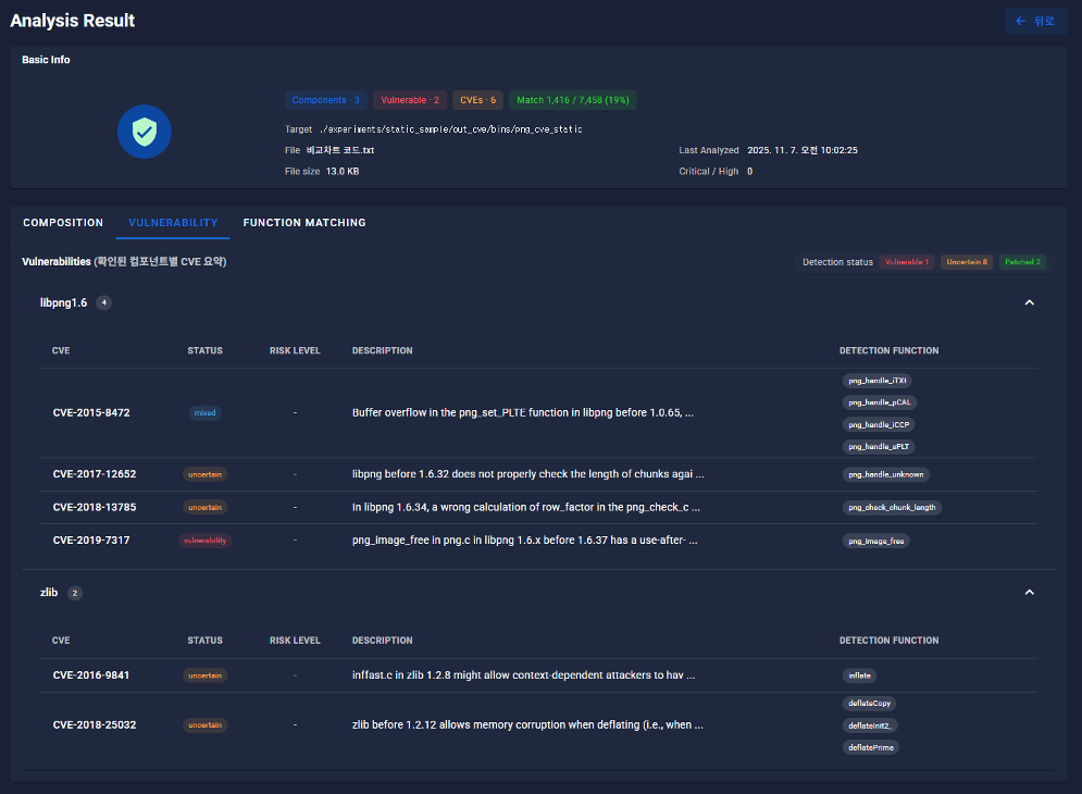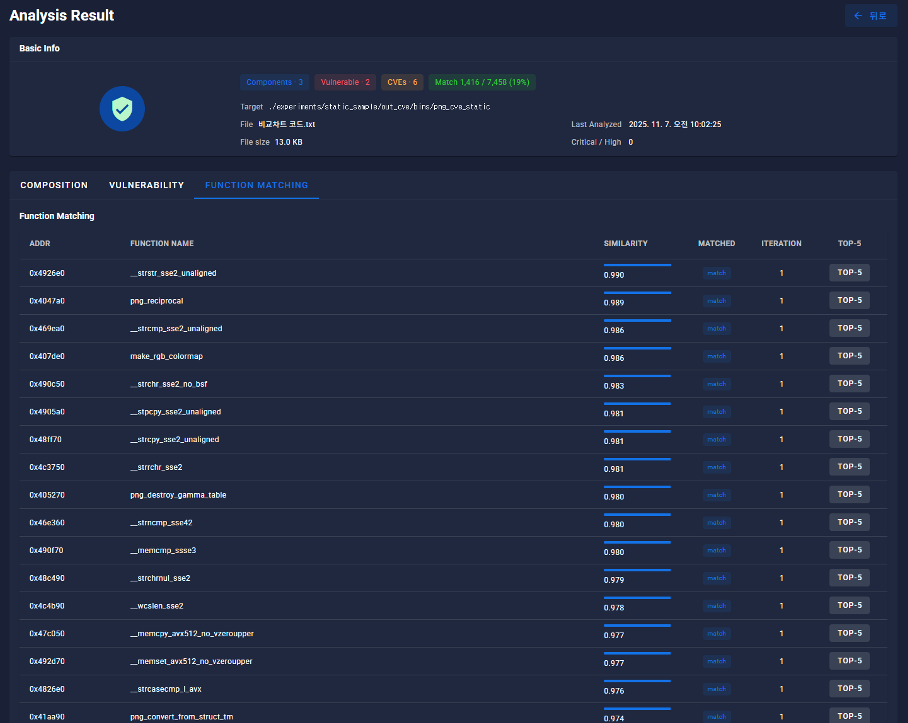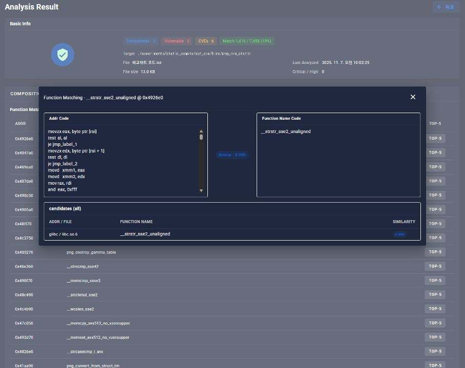 본 시스템은 바이너리 파일을 업로드하면 내부 함수를 정적으로 분석하고, 컴포넌트 구성·취약점 정보·함수 매칭 결과를 UI 기반으로 시각화하여 제공하는 분석 시스템이다. Capstone 기반 디스어셈블 엔진과 Python 분석 모듈을 통해 함수 리스트·코드 패턴·라이브러리 식별 정보를 추출하고, 취약점(CVE) 및 패치 여부를 자동 연계하여 분석자가 결과를 직관적으로 검증할 수 있도록 구성되었다.