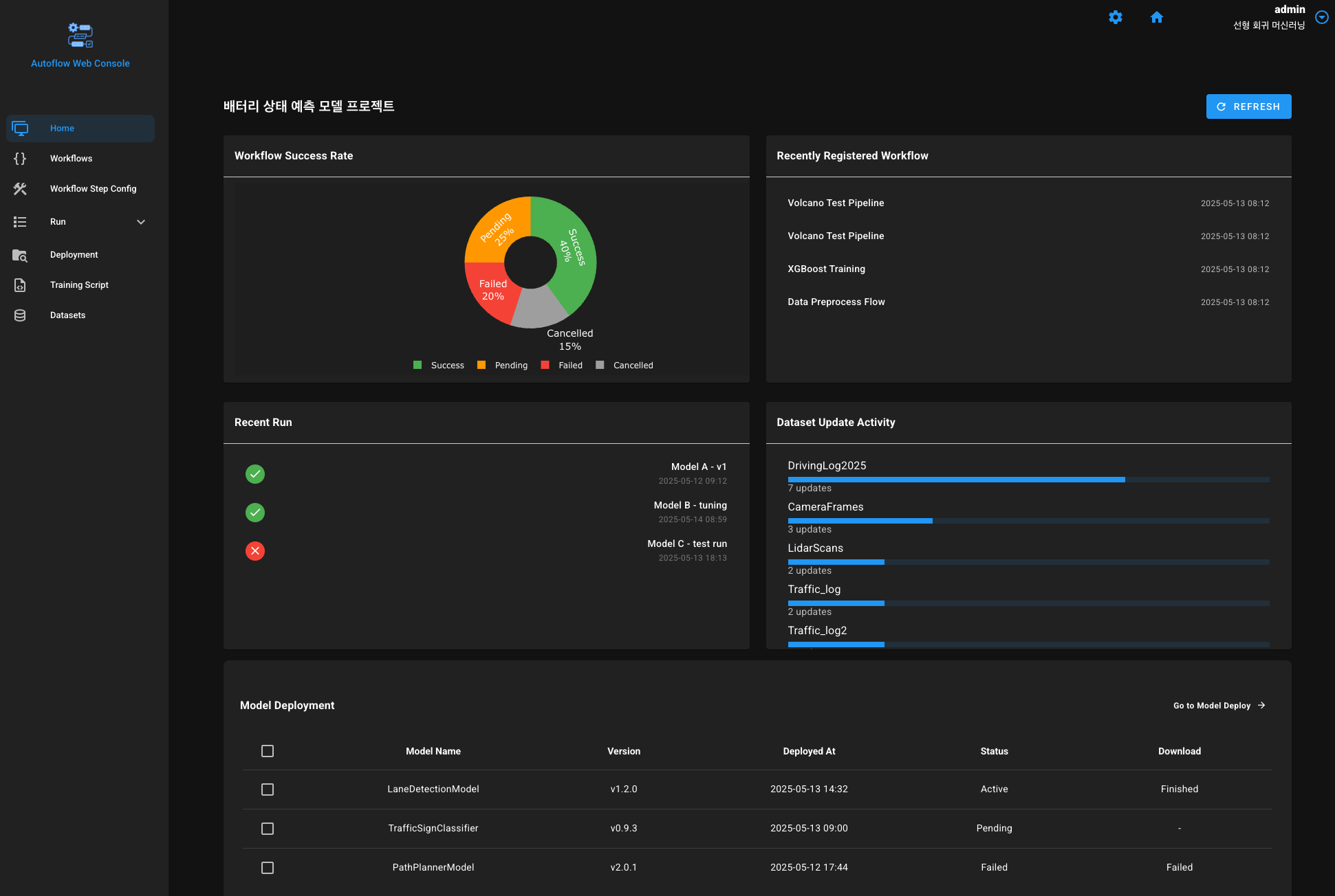 본 시스템은 자율주행 AI 학습 과정에서 발생하는 데이터 업로드, 전처리, 실험 실행, 모델 관리 등을 통합적으로 운영할 수 있도록 설계된 워크플로우 관리 시스템이다. Kubeflow Pipelines와 MLflow Tracking을 연동하여 실험 생성·실행·결과 관리 기능을 제공하며, 프로젝트·사용자·권한 관리 기능을 포함한 통합 UI를 통해 학습 파이프라인의 전 과정을 효율적으로 제어할 수 있도록 구성되었다.