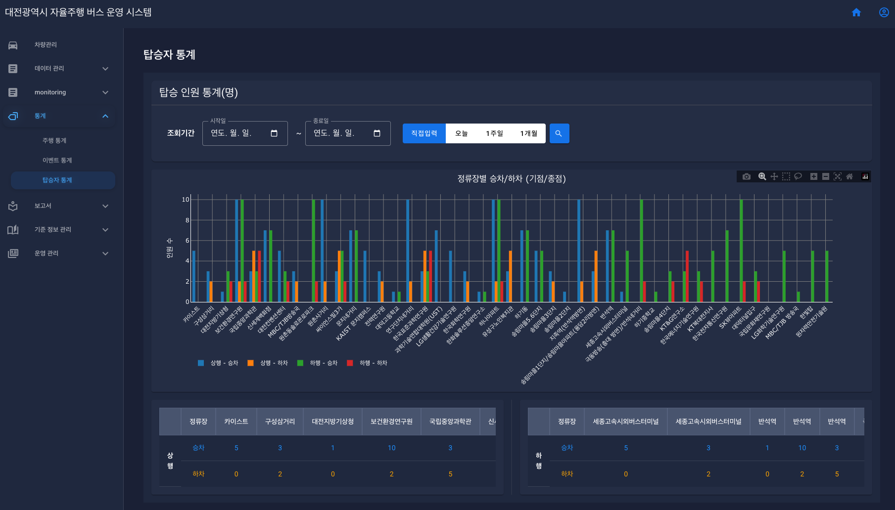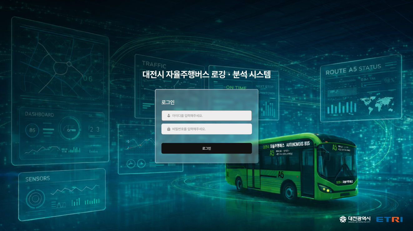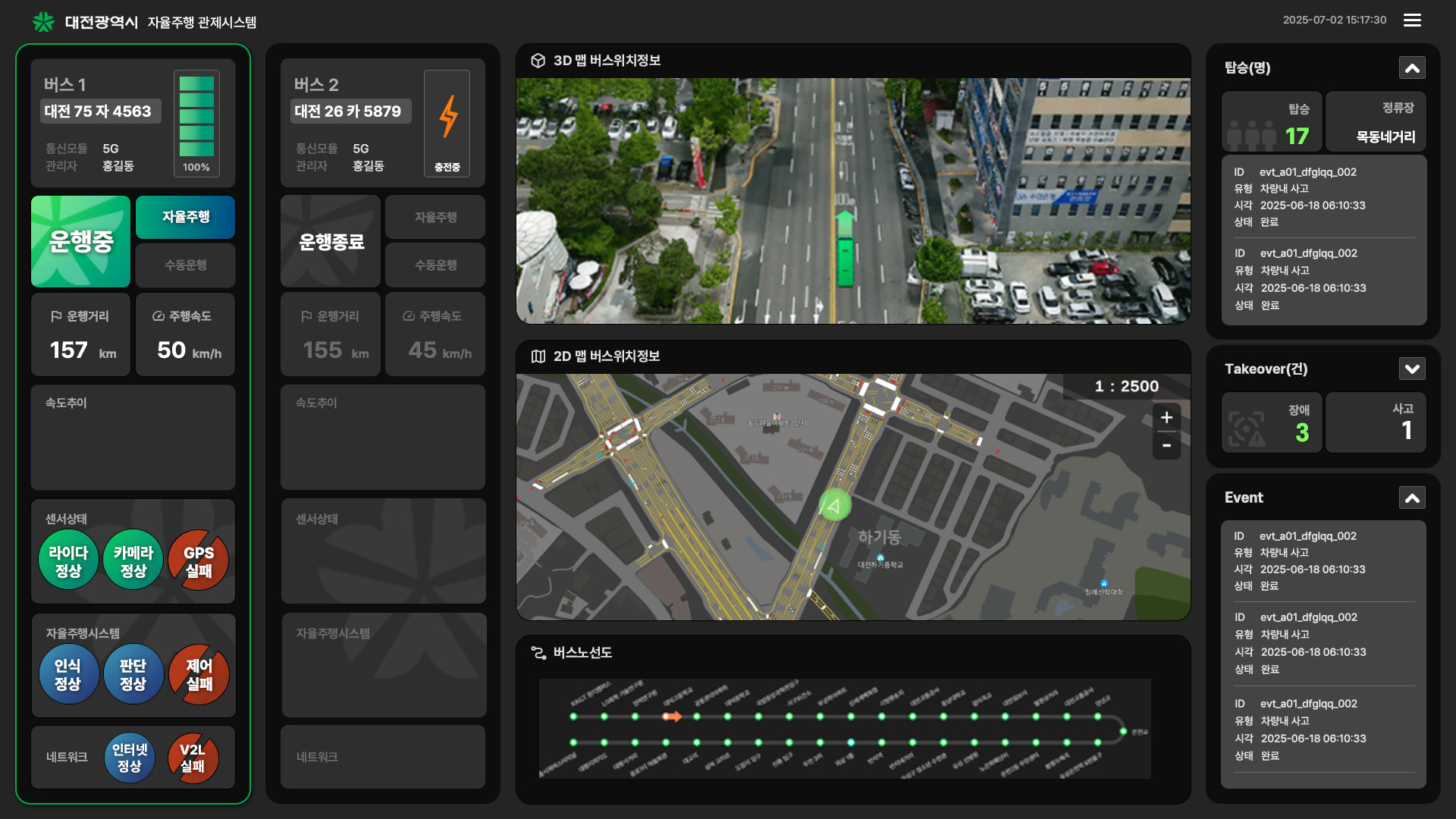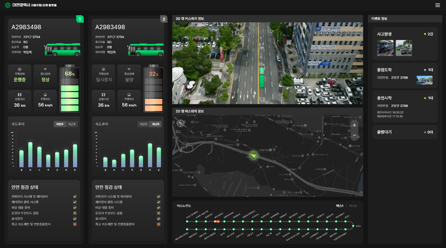 대전시 자율주행 버스를 대상으로 차량 상태, 위치, 주행 정보, 주변 인프라 정보를 통합 수집하고 실시간 관제·모니터링 기능을 제공하는 스마트 모빌리티 통합 관제 시스템